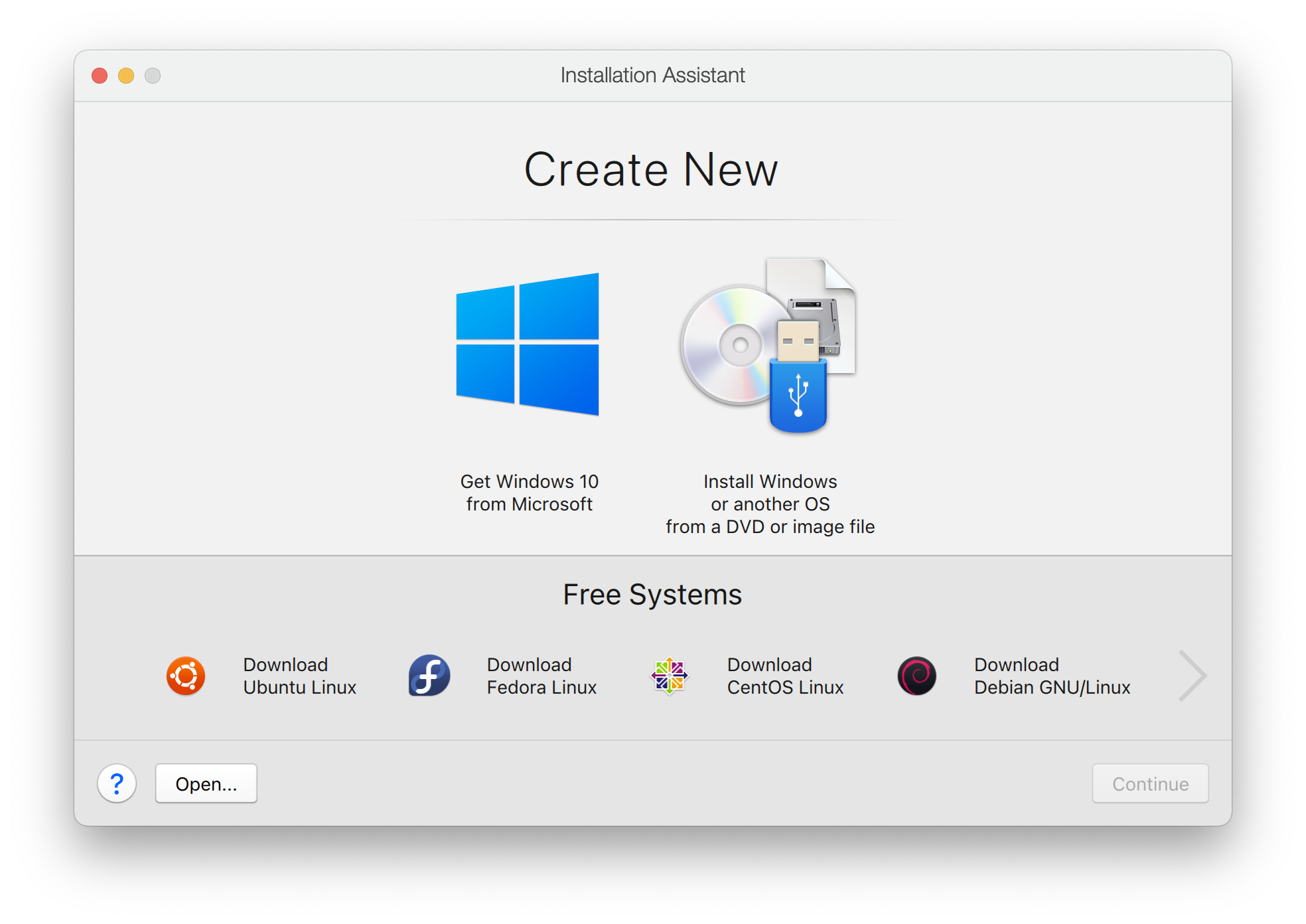 왼쪽 하단을 보게 되면, Ubuntu Linux를 설치할 수 있는 아이콘이 있는데, 저 아이콘을 클릭하여 주지 않고 직접 image file을 설치하는 오른쪽 상단 아이콘을 클릭하고 Continue 버튼을 클릭하여 줍니다.